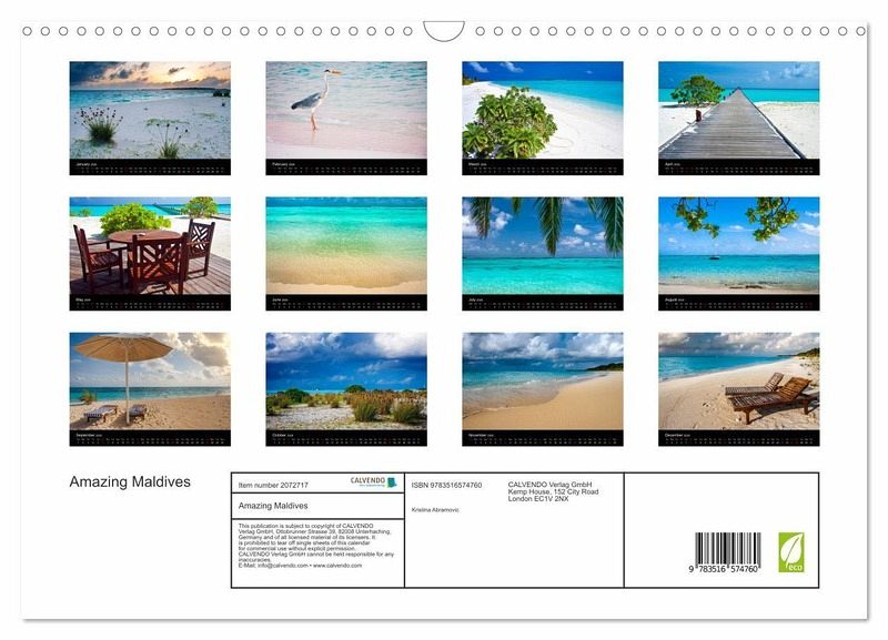 QUALITY - High-quality photo calendar with 12 beautiful images on light-resistant paper, robust spiral binding with hanger.SUSTAINABLE - Significant waste reduction due to print-on-demand production, environmentally friendly FSC-certified paper, produced in the UK, climate-conscious logistical processes.PERFECT GIFT - calendars for friends and family, for children, all ages and all occasions, from Christmas to birthdays and everything in between.LOTS OF CHOICE - Wall calendars in different sizes (DIN A4 and DIN A3), for any topic and personal taste, featuring photography, painting and illustrations.Welcome to the Maldives - the sunny side of life!, author: Kristina Abramovic