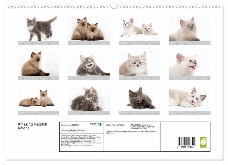 PREMIUM COLLECTION - Brilliant photo calendar with 12 beautiful motifs, high-gloss art print in museum quality.QUALITY - high-quality materials, sturdy back cover with 2 innovative insert pockets for optimum presentation on the wall.SUSTAINABLE - significant reduction in waste thanks to customised one-off production, environmentally friendly FSC-certified paper, production in Germany, climate-conscious logistics.PERFECT GIFT - calendars for friends and family, for children and adults, young and old, for Christmas, birthdays or in between.beautyfull little ragdoll Kittens von Autor(in): Fotodesign Verena Scholze