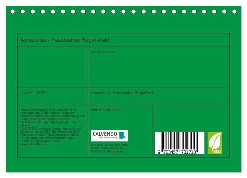 QUALITÄT - Hochwertiger Fotokalender mit 12 wunderschönen Motiven auf lichtbeständigem Bilderdruckpapier, robuste Spiralbindung.NACHHALTIG - deutliche Abfallreduzierung durch bedarfsgerechte Einzelstückfertigung, umweltfreundliches FSC-zertifiziertes Papier, Produktion in Deutschland, klimabewusste Logistik.PERFEKTES GESCHENK - Kalender für Freunde und Familie, für Kinder und Erwachsene, jung und alt, zu Weihnachten, Geburtstag oder zwischendurch.VIELFALT - Bildkalender in verschiedenen Formaten, z.B. DIN A5, DIN A4, DIN A3 sowie DIN A2. Ob Naturmotiv, Gemälde oder Fotos, ideal für ein persönliches Wohlfühlambiente.Eine faszinierende Rundreise durch den Amazonas Regenwald von Autor(in): Markus Nawrocki
