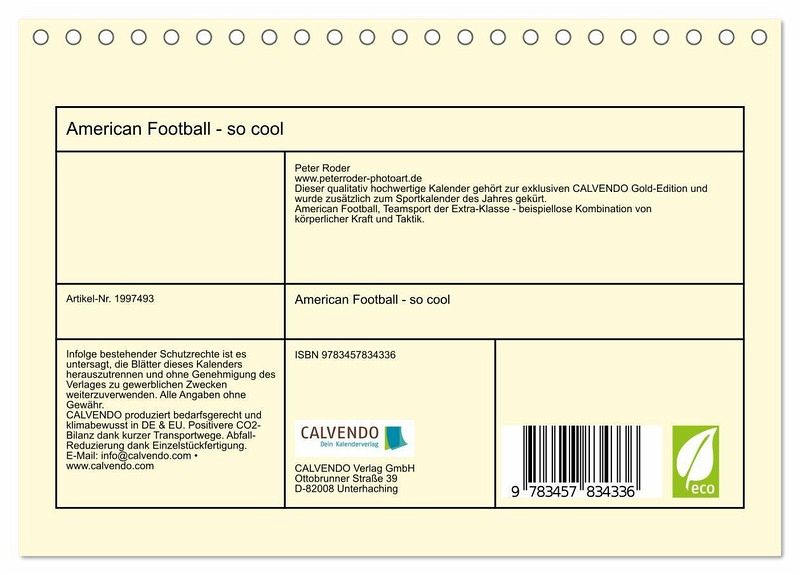 QUALITÄT - Hochwertiger Fotokalender mit 12 wunderschönen Motiven auf lichtbeständigem Bilderdruckpapier, robuste Spiralbindung.NACHHALTIG - deutliche Abfallreduzierung durch bedarfsgerechte Einzelstückfertigung, umweltfreundliches FSC-zertifiziertes Papier, Produktion in Deutschland, klimabewusste Logistik.PERFEKTES GESCHENK - Kalender für Freunde und Familie, für Kinder und Erwachsene, jung und alt, zu Weihnachten, Geburtstag oder zwischendurch.VIELFALT - Bildkalender in verschiedenen Formaten, z.B. DIN A5, DIN A4, DIN A3 sowie DIN A2. Ob Naturmotiv, Gemälde oder Fotos, ideal für ein persönliches Wohlfühlambiente.American Football, Teamsport der Extra-Klasse - beispiellose Kombination von körperlicher Kraft und Taktik. von Autor(in): Peter Roder