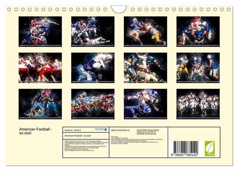 QUALITÄT - Hochwertiger Fotokalender mit 12 wunderschönen Motiven auf lichtbeständigem Bilderdruckpapier, robuste Spiralbindung mit Aufhängebügel.NACHHALTIG - deutliche Abfallreduzierung durch bedarfsgerechte Einzelstückfertigung, umweltfreundliches FSC-zertifiziertes Papier, Produktion in Deutschland, klimabewusste Logistik.PERFEKTES GESCHENK - Kalender für Freunde und Familie, für Kinder und Erwachsene, jung und alt, zu Weihnachten, Geburtstag oder zwischendurch.VIELFALT - Bildkalender in verschiedenen Formaten, z.B. DIN A5, DIN A4, DIN A3 sowie DIN A2. Ob Naturmotiv, Gemälde oder Fotos, ideal für ein persönliches Wohlfühlambiente.American Football, Teamsport der Extra-Klasse - beispiellose Kombination von körperlicher Kraft und Taktik. von Autor(in): Peter Roder