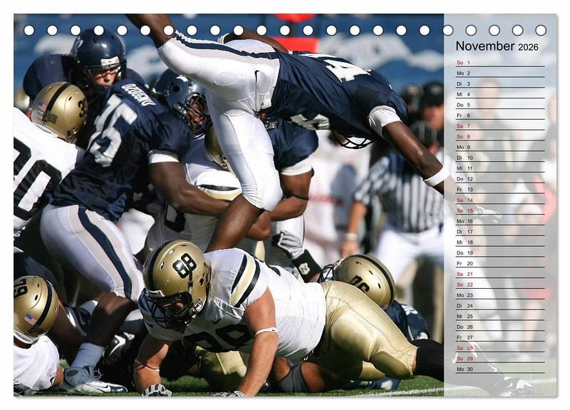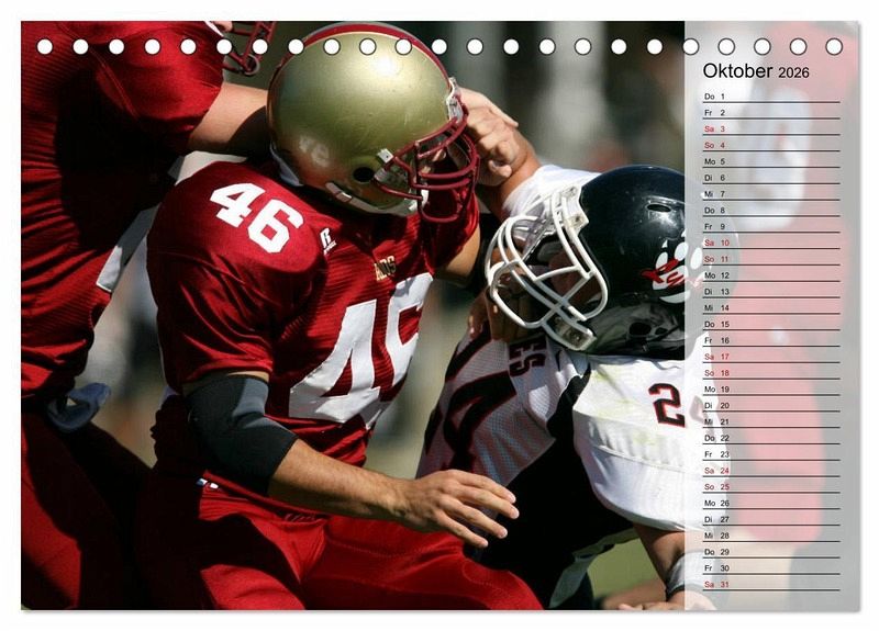 Das dynamische Mannschaftsspiel, welches mit viel Strategie und Taktik geführt wird, begeistert in Amerika Jung und Alt. Der außergewöhnliche Kalender mit Planerfunktion zeigt dynamische Spielszenen vom Kickoff bis zum Touchdown. Ein teamneutraler Footballkalender, der Fans des American Footballs bestimmt Freude bereitet.