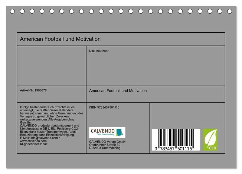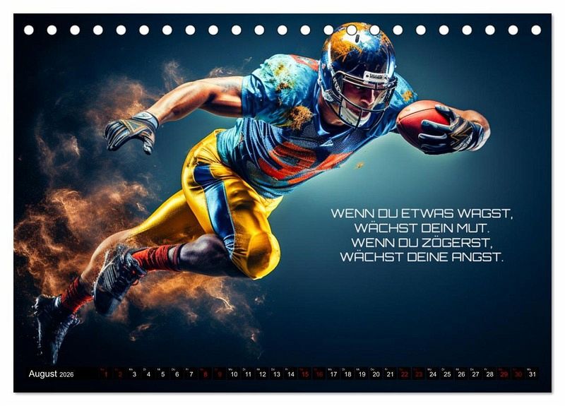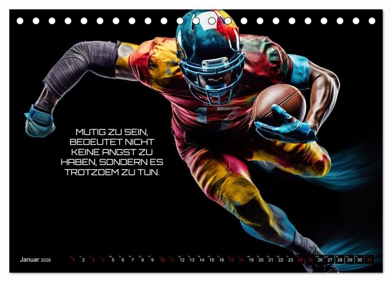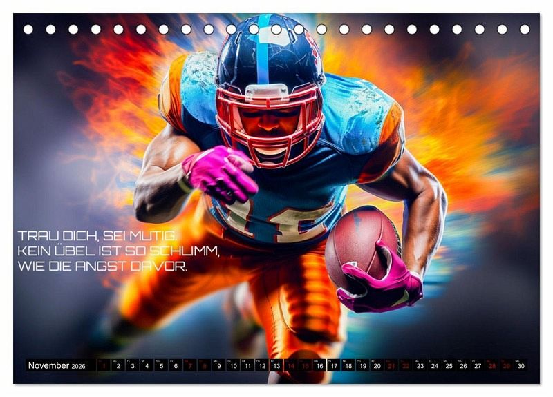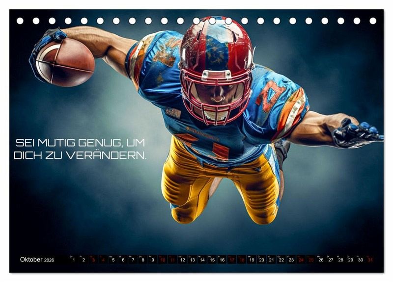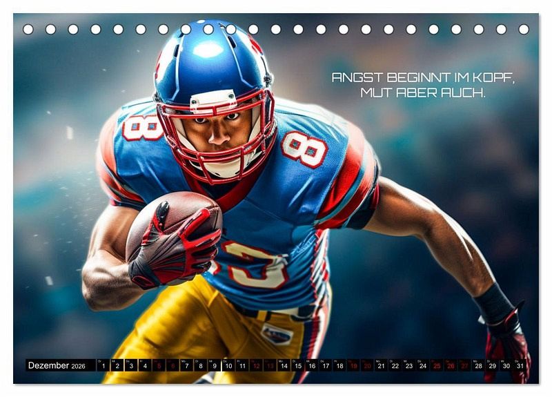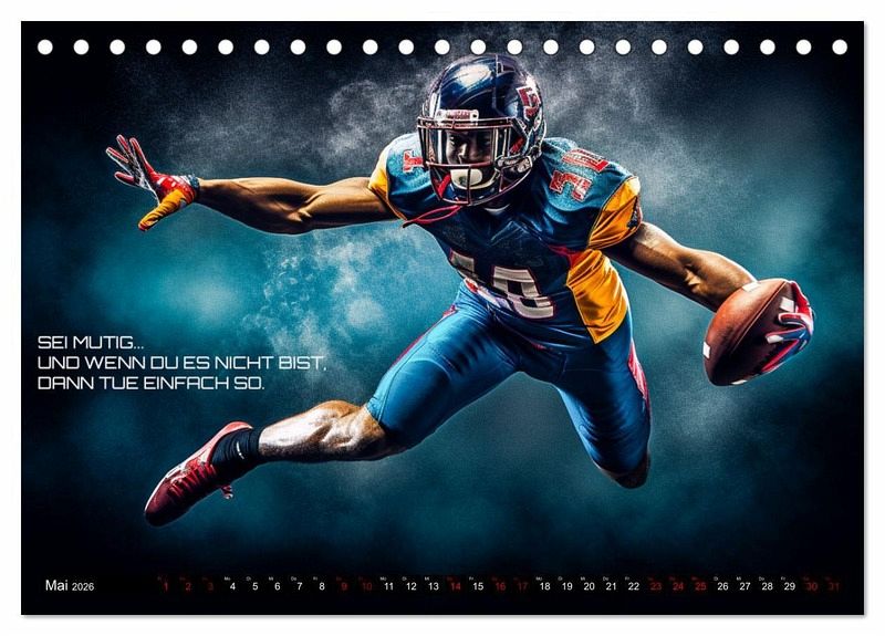 Hol dir den Wandkalender, der dich jeden Tag aufs Neue inspiriert und motiviert, deine Ziele zu erreichen! Die kraftvollen Bilder von packenden American Football-Spielern werden dich anspornen, dein Bestes zu geben und nie aufzugeben.Teamgeist und Zusammenhalt sind der Schlüssel zum Sieg. Lerne, gemeinsam Großes zu erreichen.Gib niemals auf! Auch bei Rückschlägen bleibst du stark und fokussiert wie ein echter Quarterback.Überwinde Hindernisse wie ein Running Back, immer den Blick auf die Endzone gerichtet.Konzentration ist der Schlüssel zur Meisterschaft. Trainiere deinen Fokus wie ein echter Profi.Feiere die Erfolge und Siege, die du bereits erzielt hast, und lass dich von ihnen antreiben.Vorbereitung ist alles! Gehe in die Offensive und bereite dich auf neue Herausforderungen vor.Herbstzeit ist Spielzeit - zeige der Welt, was du drauf hast und erobere das Spielfeld.Gruseln ist out - beeindrucke die Gegner lieber mit deinem Können und deiner Entschlossenheit.Gemeinsam stark! Zeige Dankbarkeit für dein Team und deine Unterstützer.Das Jahr in Touchdowns beenden! Lass das Jahr mit Erfolgen und Freude ausklingen.Dieser Wandkalender wird dich mit American Football und unerschütterlicher Motivation begleiten. Hole ihn dir jetzt und stürme gemeinsam mit uns zum Erfolg! Erstellt wurden die Bilder mit KI und Photoshop.