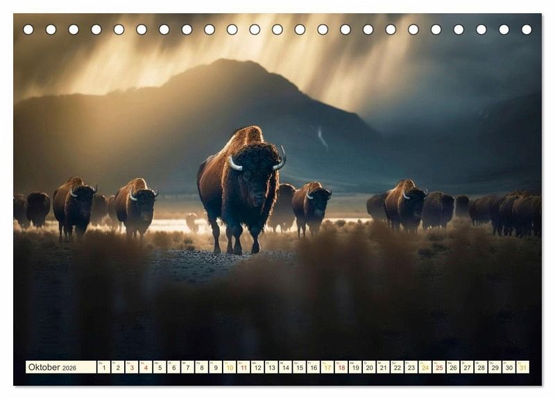 Der Amerikanische Bison, oft auch als Büffel bezeichnet, ist eines der größten Landsäugetiere. Diese mächtigen imposanten Tiere wurden durch die Besiedelung in Nordamerika bis zum Ende des 19. Jahrhunderts fast ausgerottet. Dank der Gründung von Nationalparks in Nordamerika konnten sich diese kraftvollen Tiere wieder vermehren und den Bestand sichern. Dieser von Peter Roder gestaltete KI-Kalender lässt alle Herzen höher schlagen, die sich in diese wunderbaren gewaltigen Tiere verliebt haben.