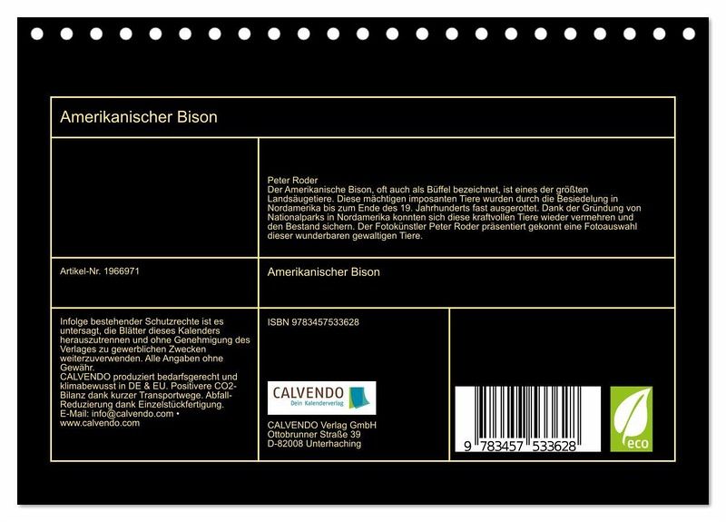 QUALITÄT - Hochwertiger Fotokalender mit 12 wunderschönen Motiven auf lichtbeständigem Bilderdruckpapier, robuste Spiralbindung.NACHHALTIG - deutliche Abfallreduzierung durch bedarfsgerechte Einzelstückfertigung, umweltfreundliches FSC-zertifiziertes Papier, Produktion in Deutschland, klimabewusste Logistik.PERFEKTES GESCHENK - Kalender für Freunde und Familie, für Kinder und Erwachsene, jung und alt, zu Weihnachten, Geburtstag oder zwischendurch.VIELFALT - Bildkalender in verschiedenen Formaten, z.B. DIN A5, DIN A4, DIN A3 sowie DIN A2. Ob Naturmotiv, Gemälde oder Fotos, ideal für ein persönliches Wohlfühlambiente.Der Amerikanische Bison - seit 2016 Nationaltier der USA von Autor(in): Peter Roder
