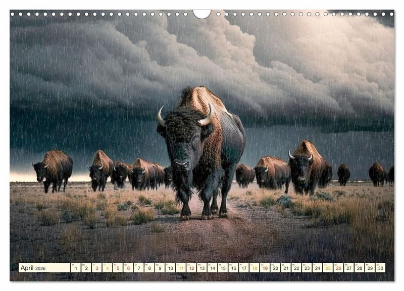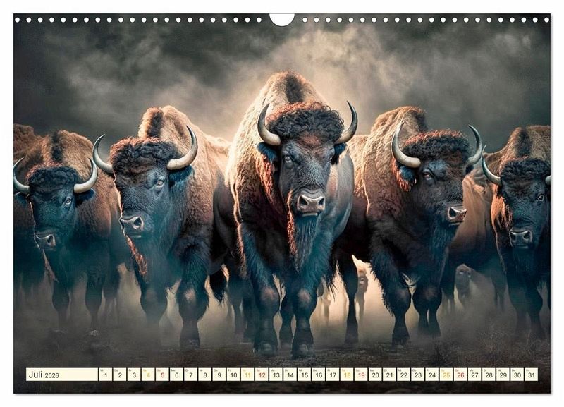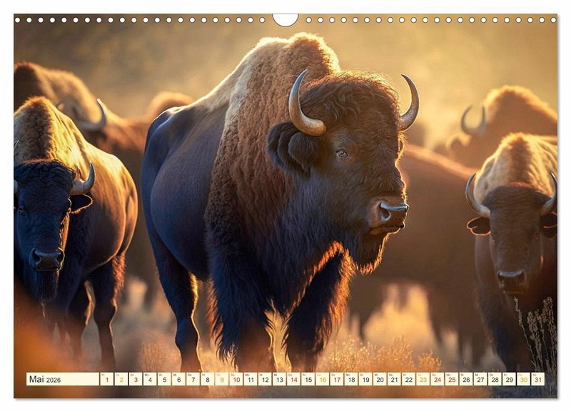 Der Amerikanische Bison, oft auch als Büffel bezeichnet, ist eines der größten Landsäugetiere. Diese mächtigen imposanten Tiere wurden durch die Besiedelung in Nordamerika bis zum Ende des 19. Jahrhunderts fast ausgerottet. Dank der Gründung von Nationalparks in Nordamerika konnten sich diese kraftvollen Tiere wieder vermehren und den Bestand sichern. Dieser von Peter Roder gestaltete KI-Kalender lässt alle Herzen höher schlagen, die sich in diese wunderbaren gewaltigen Tiere verliebt haben.