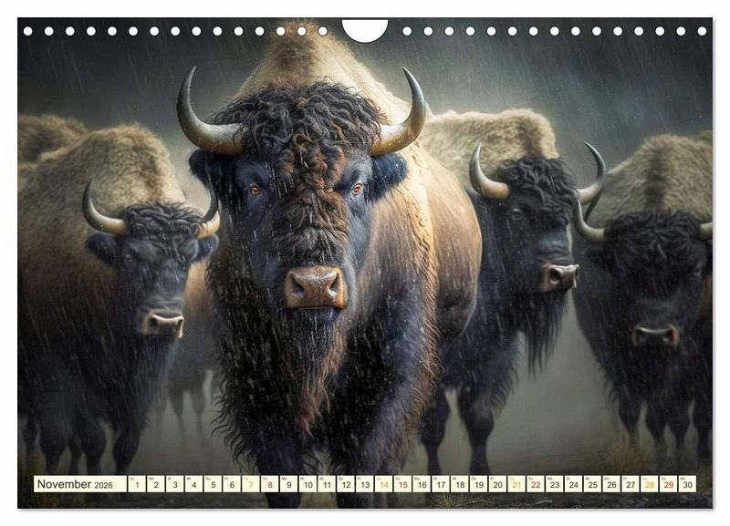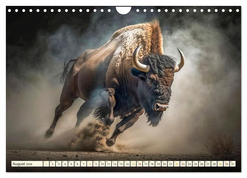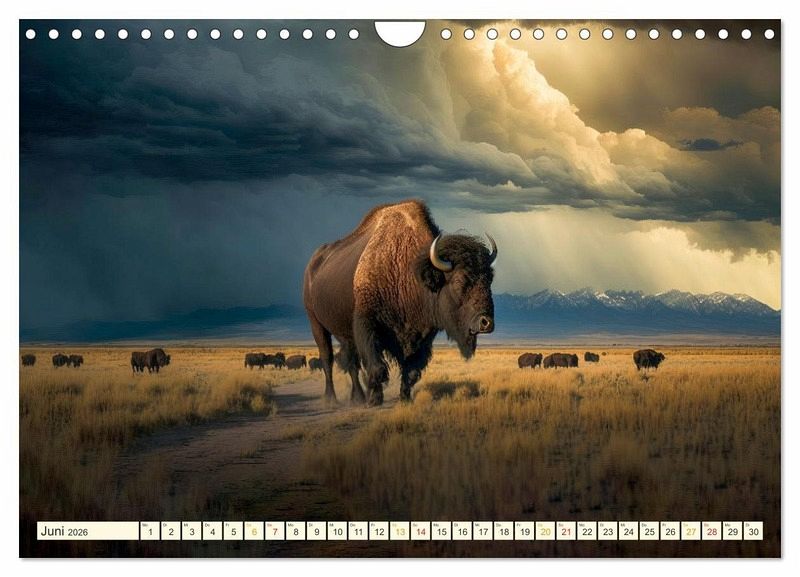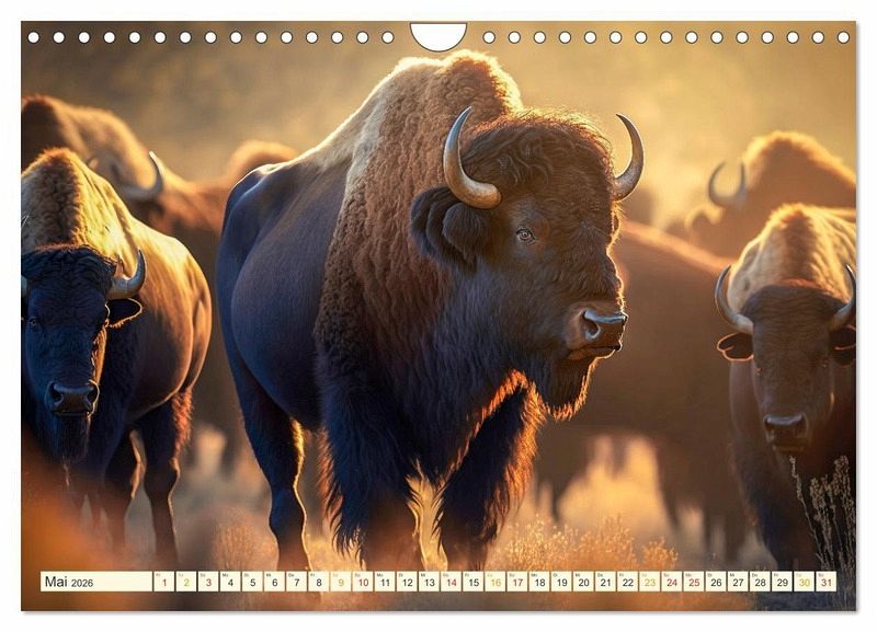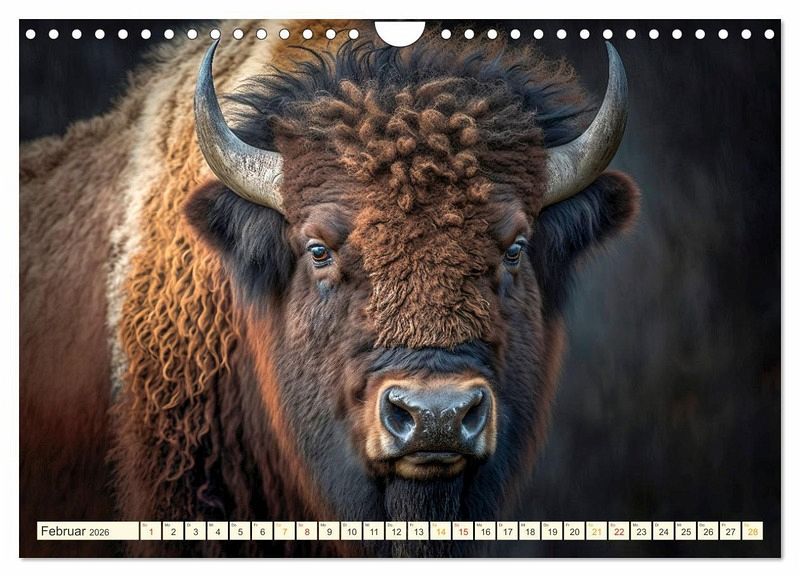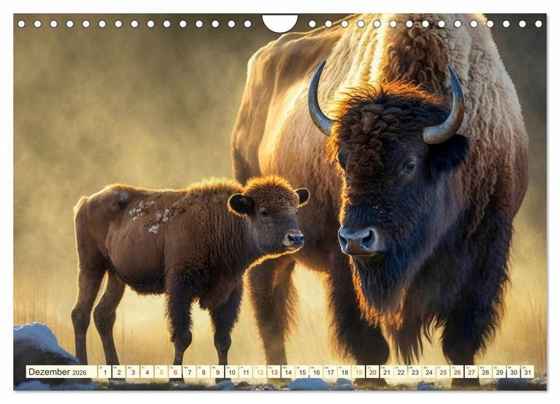 Der Amerikanische Bison, oft auch als Büffel bezeichnet, ist eines der größten Landsäugetiere. Diese mächtigen imposanten Tiere wurden durch die Besiedelung in Nordamerika bis zum Ende des 19. Jahrhunderts fast ausgerottet. Dank der Gründung von Nationalparks in Nordamerika konnten sich diese kraftvollen Tiere wieder vermehren und den Bestand sichern. Dieser von Peter Roder gestaltete KI-Kalender lässt alle Herzen höher schlagen, die sich in diese wunderbaren gewaltigen Tiere verliebt haben.