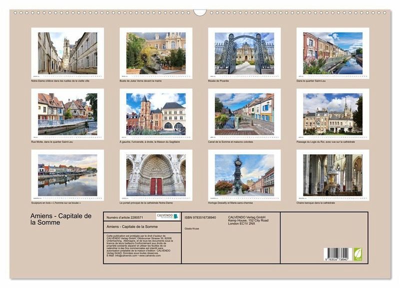 Plongez dans l'atmosphère unique d'Amiens. Ce calendrier photo haut de gamme montre la ville sous son plus beau jour, avec des vues impressionnantes de la cathédrale gothique Notre-Dame et les ruelles colorées du quartier Saint-Leu, où les maisons à colombages se reflètent dans l'eau et où les cafés invitent à la détente. Chaque motif capture le charme particulier de cette ville vivante et pittoresque, un lieu chargé d'histoire, de lumière et d'atmosphère. Un cadeau idéal pour tous ceux qui souhaitent découvrir l'Amiens authentique.