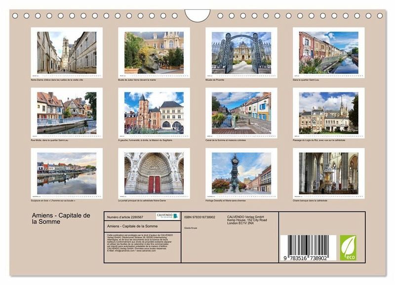 Plongez dans l'atmosphère unique d'Amiens. Ce calendrier photo haut de gamme montre la ville sous son plus beau jour, avec des vues impressionnantes de la cathédrale gothique Notre-Dame et les ruelles colorées du quartier Saint-Leu, où les maisons à colombages se reflètent dans l'eau et où les cafés invitent à la détente. Chaque motif capture le charme particulier de cette ville vivante et pittoresque, un lieu chargé d'histoire, de lumière et d'atmosphère. Un cadeau idéal pour tous ceux qui souhaitent découvrir l'Amiens authentique.