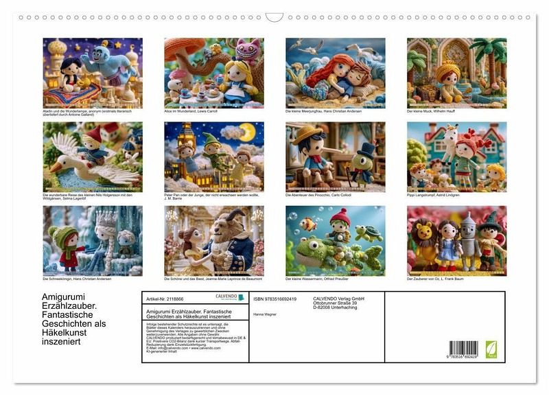 QUALITÄT - Hochwertiger Fotokalender mit 12 wunderschönen Motiven auf lichtbeständigem Bilderdruckpapier, robuste Spiralbindung mit Aufhängebügel.NACHHALTIG - deutliche Abfallreduzierung durch bedarfsgerechte Einzelstückfertigung, umweltfreundliches FSC-zertifiziertes Papier, Produktion in Deutschland, klimabewusste Logistik.PERFEKTES GESCHENK - Kalender für Freunde und Familie, für Kinder und Erwachsene, jung und alt, zu Weihnachten, Geburtstag oder zwischendurch.VIELFALT - Bildkalender in verschiedenen Formaten, z.B. DIN A5, DIN A4, DIN A3 sowie DIN A2. Ob Naturmotiv, Gemälde oder Fotos, ideal für ein persönliches Wohlfühlambiente.Märchen und Klassiker präsentieren sich als detailreiche KI-Bilder im Amigurumi-Stil. von Autor(in): Hanna Wagner