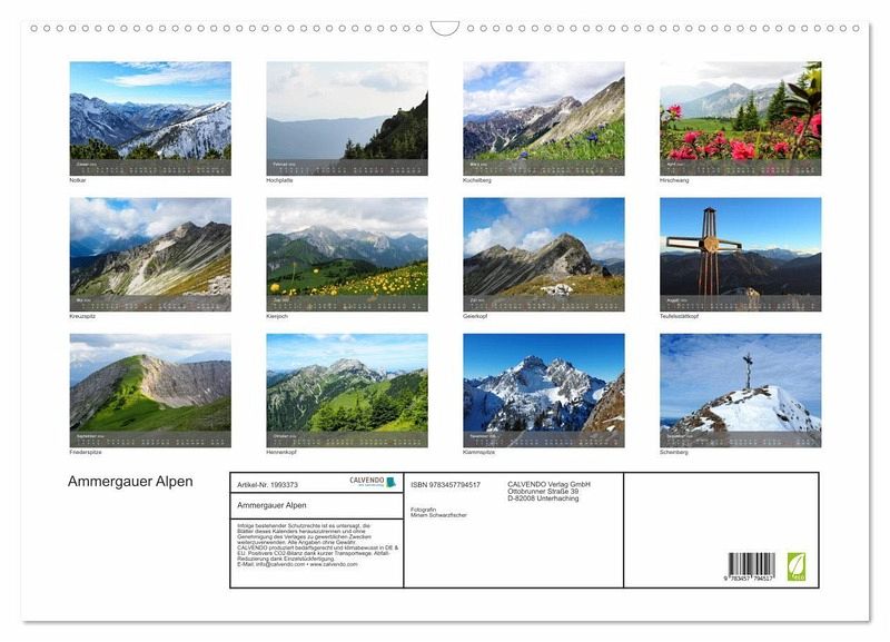 QUALITÄT - Hochwertiger Fotokalender mit 12 wunderschönen Motiven auf lichtbeständigem Bilderdruckpapier, robuste Spiralbindung mit Aufhängebügel.NACHHALTIG - deutliche Abfallreduzierung durch bedarfsgerechte Einzelstückfertigung, umweltfreundliches FSC-zertifiziertes Papier, Produktion in Deutschland, klimabewusste Logistik.PERFEKTES GESCHENK - Kalender für Freunde und Familie, für Kinder und Erwachsene, jung und alt, zu Weihnachten, Geburtstag oder zwischendurch.VIELFALT - Bildkalender in verschiedenen Formaten, z.B. DIN A5, DIN A4, DIN A3 sowie DIN A2. Ob Naturmotiv, Gemälde oder Fotos, ideal für einpersönliches Wohlfühlambiente.Einblick in den Naturpark Ammergauer Alpen Wandkalender von Autor(in): Fotografin Schwarzfischer Miriam