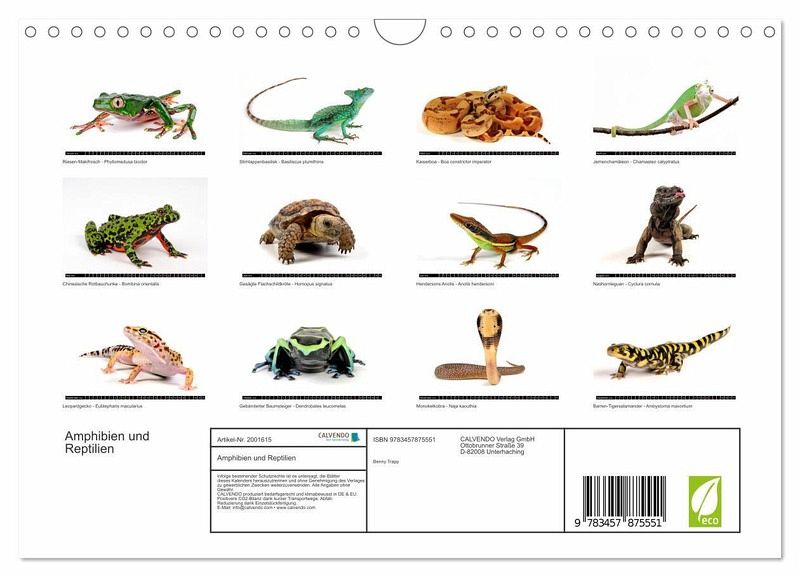 QUALITÄT - Hochwertiger Fotokalender mit 12 wunderschönen Motiven auf lichtbeständigem Bilderdruckpapier, robuste Spiralbindung mit Aufhängebügel.NACHHALTIG - deutliche Abfallreduzierung durch bedarfsgerechte Einzelstückfertigung, umweltfreundliches FSC-zertifiziertes Papier, Produktion in Deutschland, klimabewusste Logistik.PERFEKTES GESCHENK - Kalender für Freunde und Familie, für Kinder und Erwachsene, jung und alt, zu Weihnachten, Geburtstag oder zwischendurch.VIELFALT - Bildkalender in verschiedenen Formaten, z.B.DIN A5, DIN A4, DIN A3 sowie DIN A2. Ob Naturmotiv, Gemälde oder Fotos, ideal für ein persönliches Wohlfühlambiente.Amphibien und Reptilien aus aller Welt von Autor(in): Benny Trapp
