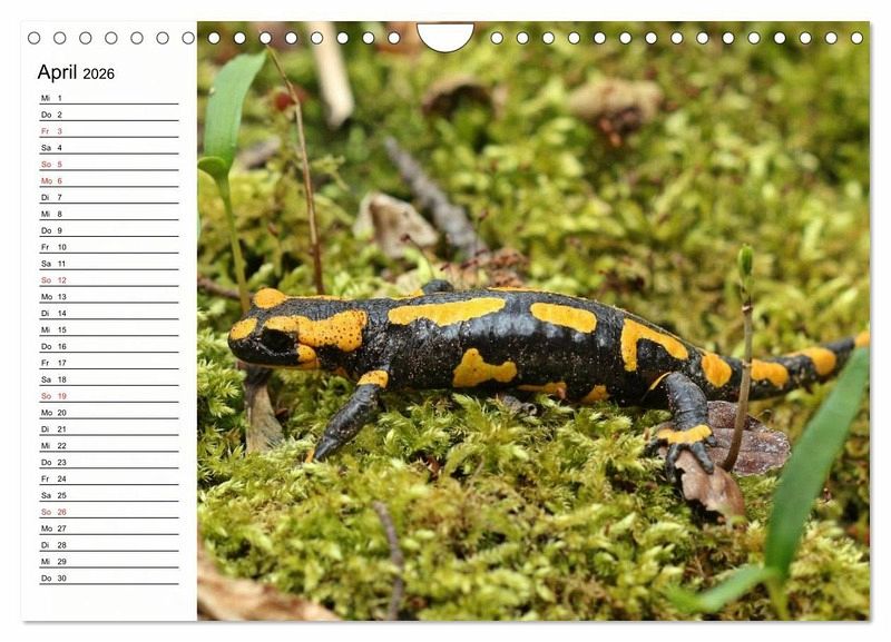 Der Kalender zeigt verschiedene Amphibien- und Reptilienarten auf 13 ungewöhnlichen Makroaufnahmen, alle aufgenommen in ihrem natürlichen Lebensraum in Hessen. In außergewöhnlichen Perspektiven und aus nächster Nähe sind Teich- und Grasfrösche, Feuersalamander, Wald- und Zauneidechse, Berg- und Teichmolch, Erdkröte und eine Blindschleiche zu sehen. Alle Aufnahmen sind im Raum Nordhessen entstanden.