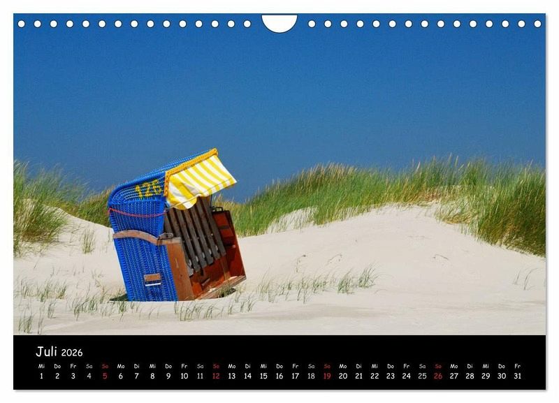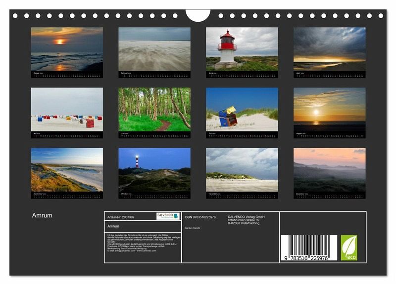 Amrum gehört zu den nordfriesischen Inseln und zeichnet sich durch seine landschaftliche Vielfalt aus. Insbesondere prägen jedoch der im Westen zur offenen See gelegene Kniepsand, eine riesige der Insel vorgelagerte Sandbank, und der angrenzende Dünengürtel den Charakter der Insel. Hier lassen sich bei jeder Witterung und zu jeder Tageszeit stimmungsvolle Eindrücke sammeln, die in den Bildern des Kalenders eingefangen wurden.