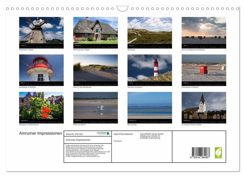 QUALITÄT - Hochwertiger Fotokalender mit 12 wunderschönen Motiven auf lichtbeständigem Bilderdruckpapier, robuste Spiralbindung mit Aufhängebügel.NACHHALTIG - deutliche Abfallreduzierung durch bedarfsgerechte Einzelstückfertigung, umweltfreundliches FSC-zertifiziertes Papier, Produktion in Deutschland, klimabewusste Logistik.PERFEKTES GESCHENK - Kalender für Freunde und Familie, für Kinder und Erwachsene, jung und alt, zu Weihnachten, Geburtstag oder zwischendurch.VIELFALT - Bildkalender in verschiedenen Formaten, z.B. DIN A5, DIN A4, DIN A3 sowie DIN A2. Ob Naturmotiv, Gemälde oder Fotos, ideal für ein persönliches Wohlfühlambiente.Impressionen von der Nordseeinsel Amrum von Autor(in): Ralf Kalytta