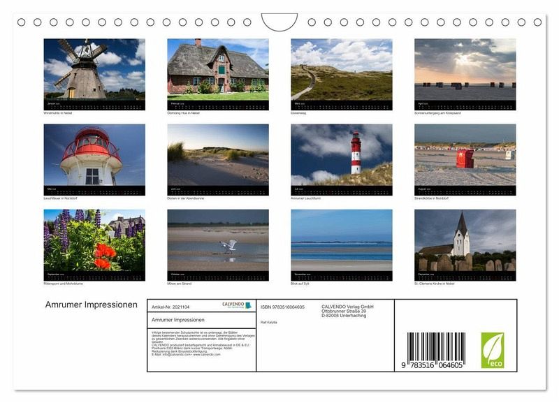 QUALITÄT - Hochwertiger Fotokalender mit 12 wunderschönen Motiven auf lichtbeständigem Bilderdruckpapier, robuste Spiralbindung mit Aufhängebügel.NACHHALTIG - deutliche Abfallreduzierung durch bedarfsgerechte Einzelstückfertigung, umweltfreundliches FSC-zertifiziertes Papier, Produktion in Deutschland, klimabewusste Logistik.PERFEKTES GESCHENK - Kalender für Freunde und Familie, für Kinder und Erwachsene, jung und alt, zu Weihnachten, Geburtstag oder zwischendurch.VIELFALT - Bildkalender in verschiedenen Formaten, z.B. DIN A5, DIN A4, DIN A3 sowie DIN A2. Ob Naturmotiv, Gemälde oder Fotos, ideal für ein persönliches Wohlfühlambiente.Impressionen von der Nordseeinsel Amrum von Autor(in): Ralf Kalytta