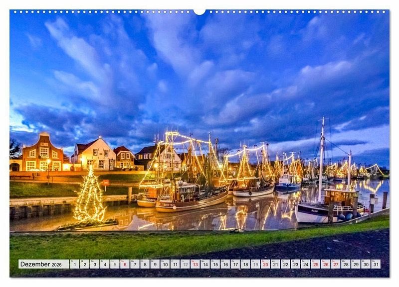 Dezember: Weihnachtsleuchten im Hafen von Greetsiel