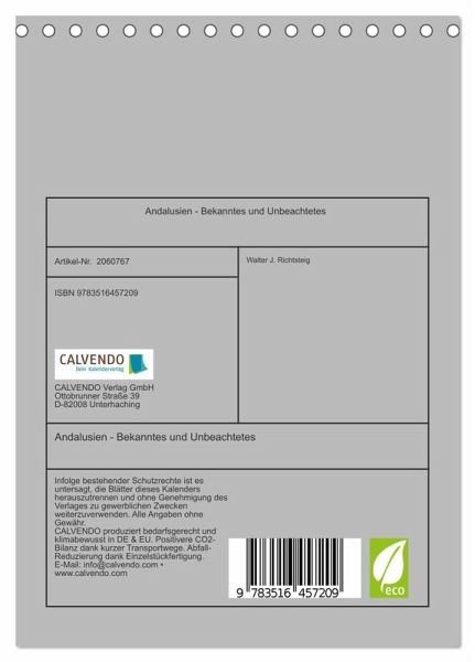 Es gibt viele Kalender über Andalusien. Der Fotograf zeigt in eindrucksvollen Bildern neben weltberühmten Gebäuden auch weniger beachtete Orte sowie Details, die aufgespürt sein wollen und insgesamt das "Gesamtkunstwerk Andalusien" ausmachen.