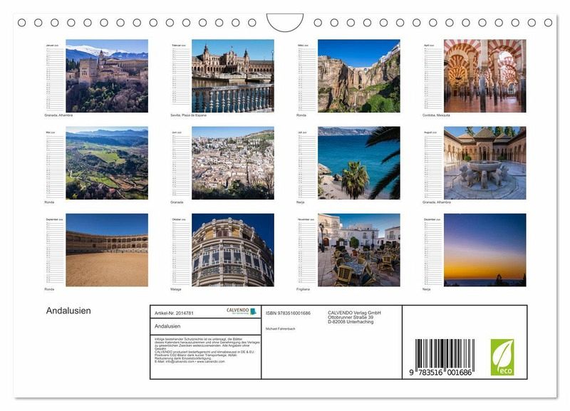QUALITÄT - Hochwertiger Fotokalender mit 12 wunderschönen Motiven auf lichtbeständigem Bilderdruckpapier, robuste Spiralbindung mit Aufhängebügel.NACHHALTIG - deutliche Abfallreduzierung durch bedarfsgerechte Einzelstückfertigung, umweltfreundliches FSC-zertifiziertes Papier, Produktion in Deutschland, klimabewusste Logistik.PERFEKTES GESCHENK - Kalender für Freunde und Familie, für Kinder und Erwachsene, jung und alt, zu Weihnachten, Geburtstag oder zwischendurch.VIELFALT - Bildkalender in verschiedenen Formaten, z.B. DIN A5, DIN A4, DIN A3 sowie DIN A2. Ob Naturmotiv, Gemälde oder Fotos, ideal für ein persönliches Wohlfühlambiente.Andalusien - der "sonnige Süden" Spaniens von Autor(in): Michael Fahrenbach