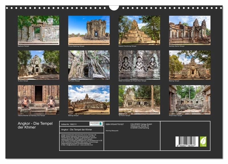 Die Tempel in Angkor - der alten Hauptstadt der Khmer - gehören zu den meistbesuchten Zielen in Kambodscha. Die Ruinen der zahllosen Tempel begeistern noch heute Besucher aus aller Welt. Die wichtigsten Sehenswürdigkeiten in Angkor hat Henning Marquardt eindrucksvoll fotografiert und in diesem Kalender versammelt.