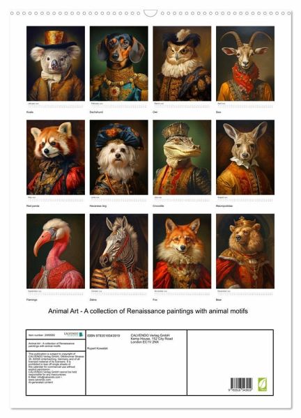 QUALITY - High-quality photo calendar with 12 beautiful images on light-resistant paper, robust spiral binding with hanger.SUSTAINABLE - Significant waste reduction due to print-on-demand production, environmentally friendly FSC-certified paper, produced in the UK, climate-conscious logistical processes.PERFECT GIFT - calendars for friends and family, for children, all ages and all occasions, from Christmas to birthdays and everything in between.LOTS OF CHOICE - Wall calendars in different sizes (DIN A4and DIN A3), for any topic and personal taste, featuring photography, painting and illustrations.Renaissance paintings with animals. Let yourself be inspired., author: Rupert Kowalski