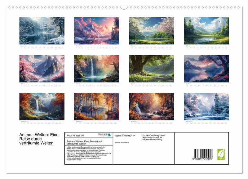 PREMIUM-LINIE - Brillanter Fotokalender mit 12 wunderschönen Motiven, Kunstdruck in Hochglanz in Museumsqualität.QUALITÄT - edle Materialien, stabile Rückwand mit 2 innovativen Einstecktaschen für eine optimale Präsentation an der Wand.NACHHALTIG - deutliche Abfallreduzierung durch bedarfsgerechte Einzelstückfertigung, umweltfreundliches FSC-zertifiziertes Papier, Produktion in Deutschland, klimabewusste Logistik.PERFEKTES GESCHENK - Kalender für Freunde und Familie, für Kinder und Erwachsene, jung und alt, zu Weihnachten, Geburtstag oder zwischendurch.Komm mit in magische Landschaften im Anime - Style! von Autor(in): Simone Wunderlich