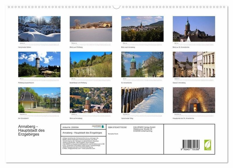 PREMIUM-LINIE - Brillanter Fotokalender mit 12 wunderschönen Motiven, Kunstdruck in Hochglanz in Museumsqualität.QUALITÄT - edle Materialien, stabile Rückwand mit 2 innovativen Einstecktaschen für eine optimale Präsentation an der Wand.NACHHALTIG - deutliche Abfallreduzierung durch bedarfsgerechte Einzelstückfertigung, umweltfreundliches FSC-zertifiziertes Papier, Produktion in Deutschland, klimabewusste Logistik.PERFEKTES GESCHENK - Kalender für Freunde und Familie, für Kinder und Erwachsene, jung und alt, zu Weihnachten, Geburtstag oder zwischendurch.Abwechslungsreiche Fotos der alten Bergstadt Annaberg im Erzgebirge von Autor(in): Reinalde Roick