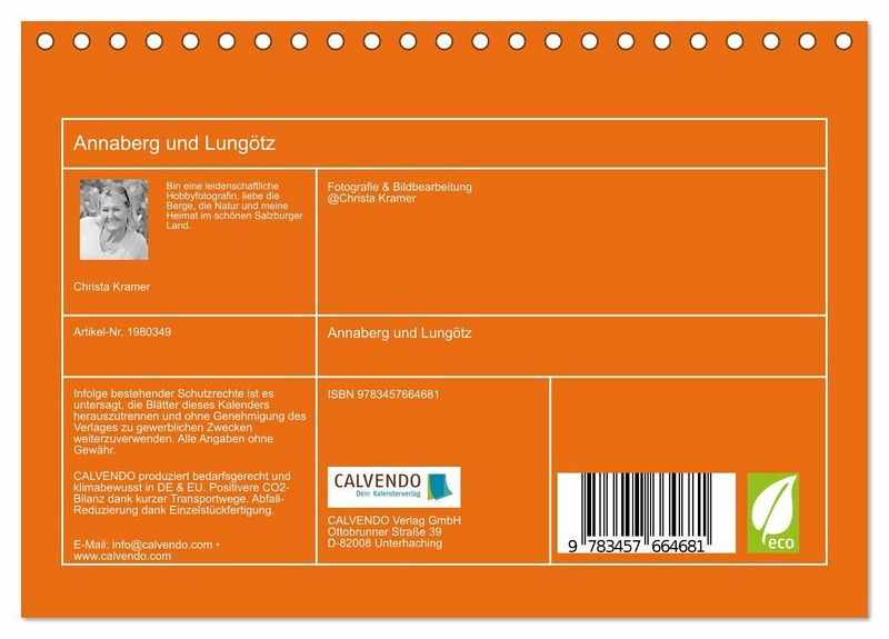 QUALITÄT - Hochwertiger Fotokalender mit 12 wunderschönen Motiven auf lichtbeständigem Bilderdruckpapier, robuste Spiralbindung.NACHHALTIG - deutliche Abfallreduzierung durch bedarfsgerechte Einzelstückfertigung, umweltfreundliches FSC-zertifiziertes Papier, Produktion in Deutschland, klimabewusste Logistik.PERFEKTES GESCHENK - Kalender für Freunde und Familie, für Kinder und Erwachsene, jung und alt, zu Weihnachten, Geburtstag oder zwischendurch.VIELFALT - Bildkalender in verschiedenen Formaten, z.B. DIN A5, DIN A4, DIN A3 sowie DIN A2. Ob Naturmotiv, Gemälde oder Fotos, ideal für ein persönliches Wohlfühlambiente.Schöne Impressionen von Annaberg und Lungötz im Lammertal von Autor(in): Christa Kramer