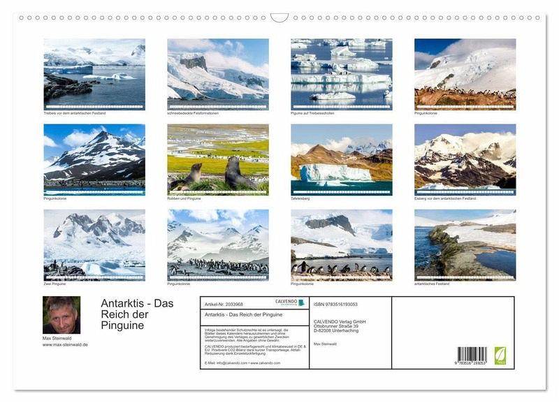 QUALITÄT - Hochwertiger Fotokalender mit 12 wunderschönen Motiven auf lichtbeständigem Bilderdruckpapier, robuste Spiralbindung mit Aufhängebügel.NACHHALTIG - deutliche Abfallreduzierung durch bedarfsgerechte Einzelstückfertigung, umweltfreundliches FSC-zertifiziertes Papier, Produktion in Deutschland, klimabewusste Logistik.PERFEKTES GESCHENK - Kalender für Freunde und Familie, für Kinder und Erwachsene, jung und alt, zu Weihnachten, Geburtstag oder zwischendurch.VIELFALT - Bildkalender in verschiedenen Formaten, z.B. DIN A5, DIN A4, DIN A3 sowie DIN A2. Ob Naturmotiv, Gemälde oder Fotos, ideal für ein persönliches Wohlfühlambiente.Antarktis - Lebensraum der Pinguine - Ein Blickfang im Büro und zu Hause von Autor(in): Max Steinwald