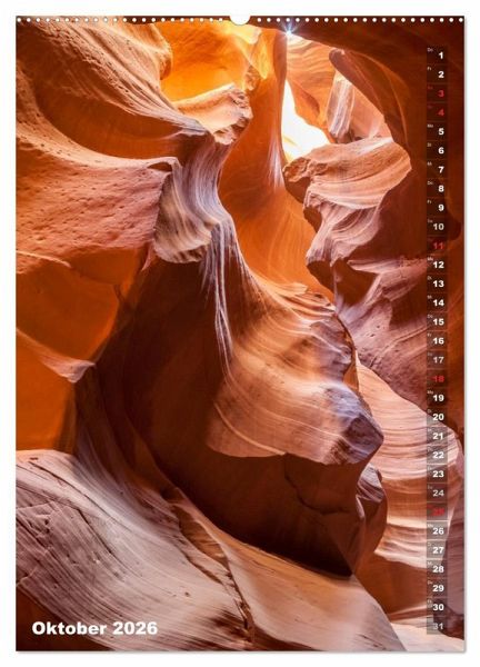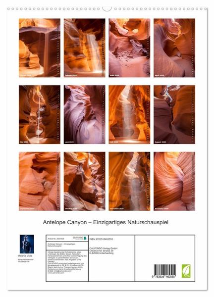 Antelope Canyon ist eines der erlesensten Geschenke der Natur. Der Canyon liegt in der Nähe der Stadt Page und dem Lake Powell (Arizona/USA) im Navajo Reservat. Es ist ein schmaler Canyon mit fantastischen Felsformationen die durch Wasser und Wind über die Jahrmillionen entstanden sind. Der Sandsteincanyon wird durch Licht erhellt, das durch kleine Felsspalten fällt. Das reflektierende Sonnenlicht lässt die Wände in erstaunlichen Farben erscheinen. Wunderschöne Lichtsäulen (light beams) sind ein Highlight, die nur zur Mittagszeit zu erleben sind. Dieser Kalender liefert faszinierende Einblicke in die einzigartige Landschaft. Genießen Sie die zahlreichen Ansichten!