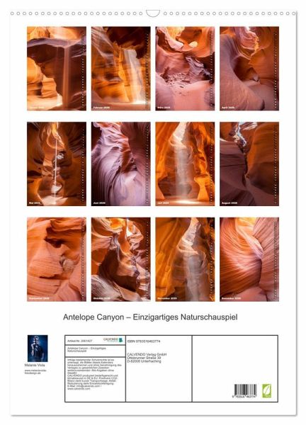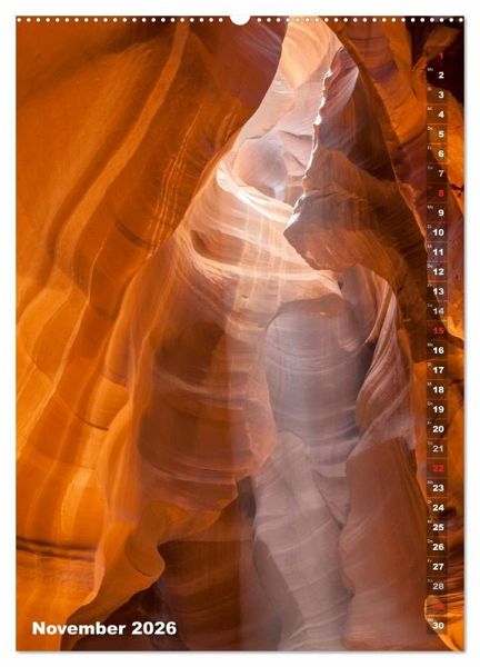 Antelope Canyon ist eines der erlesensten Geschenke der Natur. Der Canyon liegt in der Nähe der Stadt Page und dem Lake Powell (Arizona/USA) im Navajo Reservat. Es ist ein schmaler Canyon mit fantastischen Felsformationen die durch Wasser und Wind über die Jahrmillionen entstanden sind. Der Sandsteincanyon wird durch Licht erhellt, das durch kleine Felsspalten fällt. Das reflektierende Sonnenlicht lässt die Wände in erstaunlichen Farben erscheinen. Wunderschöne Lichtsäulen (light beams) sind ein Highlight, die nur zur Mittagszeit zu erleben sind. Dieser Kalender liefert faszinierende Einblicke in die einzigartige Landschaft. Genießen Sie die zahlreichen Ansichten!