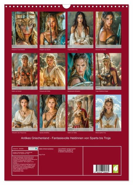 Tauchen Sie ein in die Welt des antiken Griechenlands mit dem Kalender "Antikes Griechenland - Fantasievolle Heldinnen von Sparta bis Troja". Jeder Monat präsentiert eine beeindruckende KI-genrierte Illustration einer fiktiven antiken griechischen Heldin, gestaltet mit viel künstlerischer Fantasie. Erleben Sie die legendären Frauenfiguren der Amazonen in der griechischen Gesellschaft in epischen Szenen und lassen Sie sich von ihrer Stärke und Anmut inspirieren.