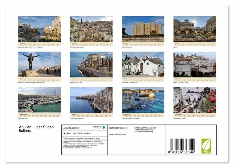 QUALITÄT - Hochwertiger Fotokalender mit 12 wunderschönen Motiven auf lichtbeständigem Bilderdruckpapier, robuste Spiralbindung mit Aufhängebügel.NACHHALTIG - deutliche Abfallreduzierung durch bedarfsgerechte Einzelstückfertigung, umweltfreundliches FSC-zertifiziertes Papier, Produktion in Deutschland, klimabewusste Logistik.PERFEKTES GESCHENK - Kalender für Freunde und Familie, für Kinder und Erwachsene, jung und alt, zu Weihnachten, Geburtstag oder zwischendurch.VIELFALT - Bildkalender in verschiedenen Formaten, z.B. DIN A5, DIN A4, DIN A3 sowie DIN A2. Ob Naturmotiv, Gemälde oder Fotos, ideal für ein persönliches Wohlfühlambiente.Eine Reise durch Apulien mit seinen verschiedenen Eindrücke. von Autor(in): Ramona Benahmed