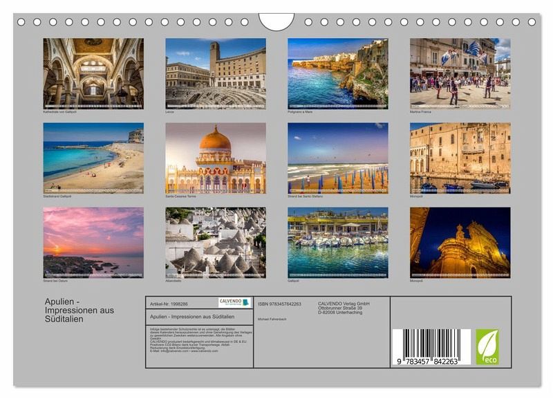 QUALITÄT - Hochwertiger Fotokalender mit 12 wunderschönen Motiven auf lichtbeständigem Bilderdruckpapier, robuste Spiralbindung mit Aufhängebügel.NACHHALTIG - deutliche Abfallreduzierung durch bedarfsgerechte Einzelstückfertigung, umweltfreundliches FSC-zertifiziertes Papier, Produktion in Deutschland, klimabewusste Logistik.PERFEKTES GESCHENK - Kalender für Freunde und Familie, für Kinder und Erwachsene, jung und alt, zu Weihnachten, Geburtstag oder zwischendurch.VIELFALT - Bildkalender in verschiedenen Formaten, z.B. DIN A5, DIN A4, DIN A3 sowie DIN A2. Ob Naturmotiv, Gemälde oder Fotos, ideal für ein persönliches Wohlfühlambiente.Apulien, die südlichste Provinz Italiens, bietet neben herrlichen Sandstränden viele schöne Ortschaften zum Bummeln und Besichtigen. von Autor(in): Michael Fahrenbach