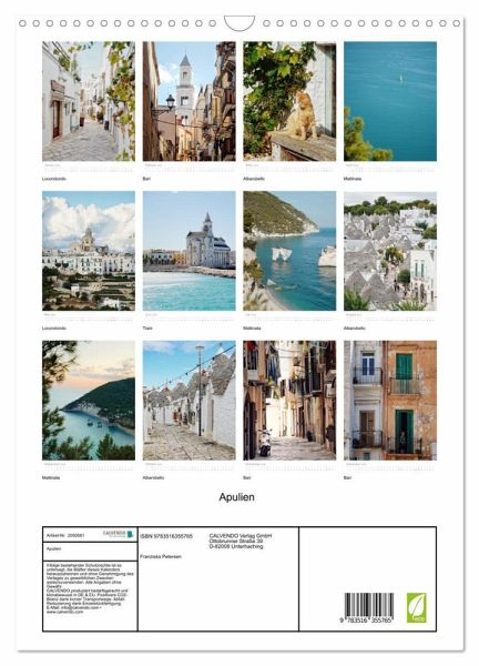 Dieser Kalender nimmt sie mit auf eine Reise durch das wunderschöne italienische Apulien. Von Mattinatas Küste geht es über Bari, Trani und Locorotondo in das berühmte UNESCO Welterbe Alberobello.