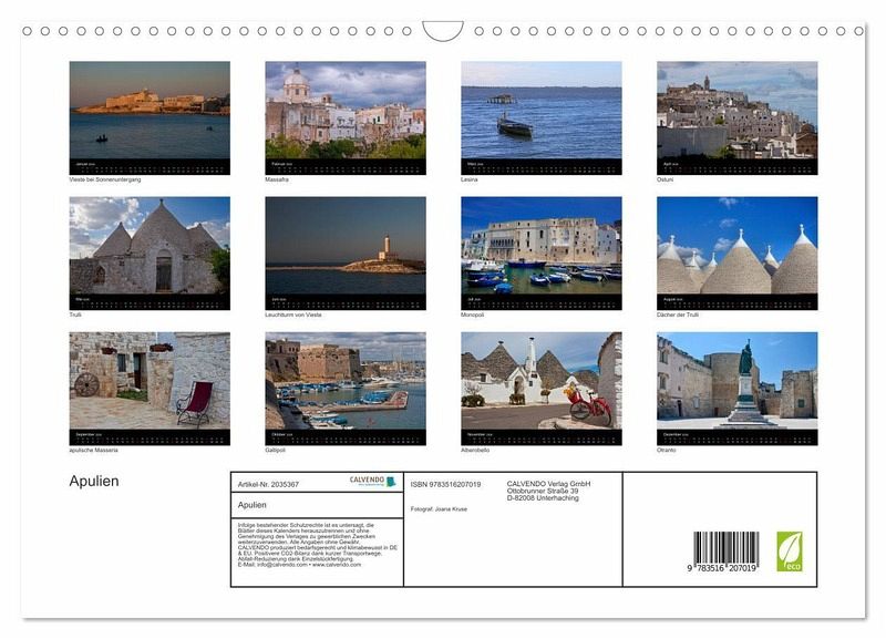 QUALITÄT - Hochwertiger Fotokalender mit 12 wunderschönen Motiven auf lichtbeständigem Bilderdruckpapier, robuste Spiralbindung mit Aufhängebügel.NACHHALTIG - deutliche Abfallreduzierung durch bedarfsgerechte Einzelstückfertigung, umweltfreundliches FSC-zertifiziertes Papier, Produktion in Deutschland, klimabewusste Logistik.PERFEKTES GESCHENK - Kalender für Freunde und Familie, für Kinder und Erwachsene, jung und alt, zu Weihnachten, Geburtstag oder zwischendurch.VIELFALT - Bildkalender in verschiedenen Formaten, z.B. DIN A5, DIN A4, DIN A3 sowie DIN A2. Ob Naturmotiv, Gemälde oder Fotos, ideal für ein persönliches Wohlfühlambiente.Apulien liegt in Süditalien an der Ferse des italienischen Stiefels. Bekannt geworden ist es durch seine typischen Trulli - Häuser mit runden Steindächern. von Autor(in): Joana Kruse