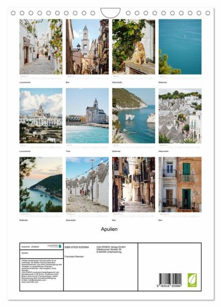 Dieser Kalender nimmt sie mit auf eine Reise durch das wunderschöne italienische Apulien. Von Mattinatas Küste geht es über Bari, Trani und Locorotondo in das berühmte UNESCO Welterbe Alberobello.