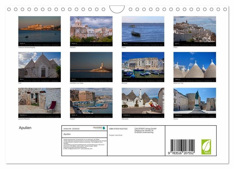 QUALITÄT - Hochwertiger Fotokalender mit 12 wunderschönen Motiven auf lichtbeständigem Bilderdruckpapier, robuste Spiralbindung mit Aufhängebügel.NACHHALTIG - deutliche Abfallreduzierung durch bedarfsgerechte Einzelstückfertigung, umweltfreundliches FSC-zertifiziertes Papier, Produktion in Deutschland, klimabewusste Logistik.PERFEKTES GESCHENK - Kalender für Freunde und Familie, für Kinder und Erwachsene, jung und alt, zu Weihnachten, Geburtstag oder zwischendurch.VIELFALT - Bildkalender in verschiedenen Formaten, z.B. DIN A5, DIN A4, DIN A3 sowie DIN A2. Ob Naturmotiv, Gemälde oder Fotos, ideal für ein persönliches Wohlfühlambiente.Apulien liegt in Süditalien an der Ferse des italienischen Stiefels. Bekannt geworden ist es durch seine typischen Trulli - Häuser mit runden Steindächern. von Autor(in): Joana Kruse