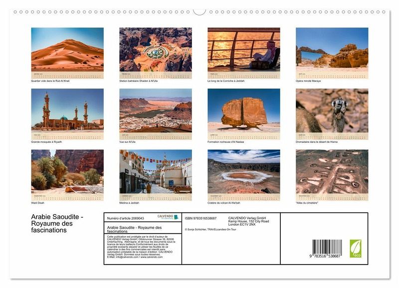 Sonja Schlichter a parcouru 15 000 km en 6 mois, affrontant des températures allant jusqu'à 52°C pour découvrir une petite partie de la beauté de ce pays. Du dangereux Quart Vide dans le sud du plus grand désert de sable continu au monde, jusqu'au nord et à la grâce époustouflante des régions de Tabuk et Al'Ula.Des gens chaleureux et curieux, leur hospitalité généreuse et leur délicieuse cuisine lui ont permis de supporter les épreuves parfois ardues. Elle a donné son coeur à ce pays.Avec son calendrier sur le Royaume d'Arabie Saoudite, elle vous emmène dans des régions que peu de touristes ont osé explorer. Des formations rocheuses bizarres dans un désert aux richesses minières d'or et des oasis et wadis époustouflants vous accompagneront pendant 12 mois avec ce magnifique calendrier.