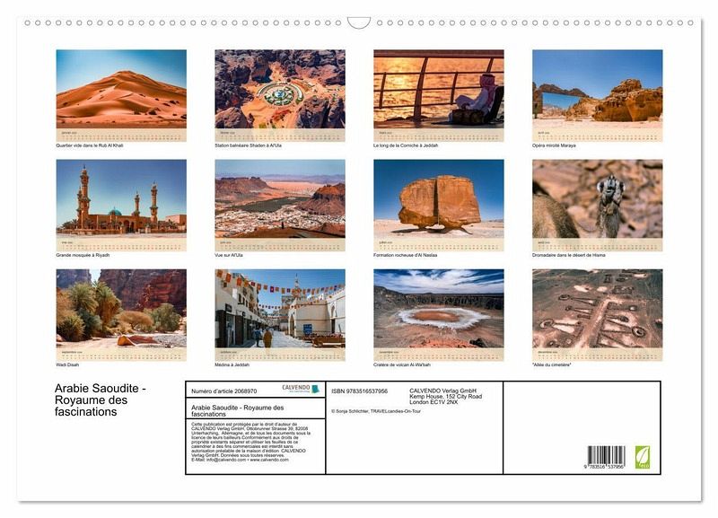Sonja Schlichter a parcouru 15 000 km en 6 mois, affrontant des températures allant jusqu'à 52°C pour découvrir une petite partie de la beauté de ce pays. Du dangereux Quart Vide dans le sud du plus grand désert de sable continu au monde, jusqu'au nord et à la grâce époustouflante des régions de Tabuk et Al'Ula.Des gens chaleureux et curieux, leur hospitalité généreuse et leur délicieuse cuisine lui ont permis de supporter les épreuves parfois ardues. Elle a donné son coeur à ce pays.Avec son calendrier sur le Royaume d'Arabie Saoudite, elle vous emmène dans des régions que peu de touristes ont osé explorer. Des formations rocheuses bizarres dans un désert aux richesses minières d'or et des oasis et wadis époustouflants vous accompagneront pendant 12 mois avec ce magnifique calendrier.