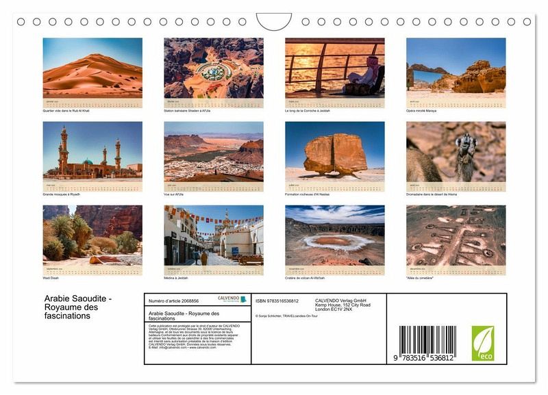 Sonja Schlichter a parcouru 15 000 km en 6 mois, affrontant des températures allant jusqu'à 52°C pour découvrir une petite partie de la beauté de ce pays. Du dangereux Quart Vide dans le sud du plus grand désert de sable continu au monde, jusqu'au nord et à la grâce époustouflante des régions de Tabuk et Al'Ula.Des gens chaleureux et curieux, leur hospitalité généreuse et leur délicieuse cuisine lui ont permis de supporter les épreuves parfois ardues. Elle a donné son coeur à ce pays.Avec son calendrier sur le Royaume d'Arabie Saoudite, elle vous emmène dans des régions que peu de touristes ont osé explorer. Des formations rocheuses bizarres dans un désert aux richesses minières d'or et des oasis et wadis époustouflants vous accompagneront pendant 12 mois avec ce magnifique calendrier.