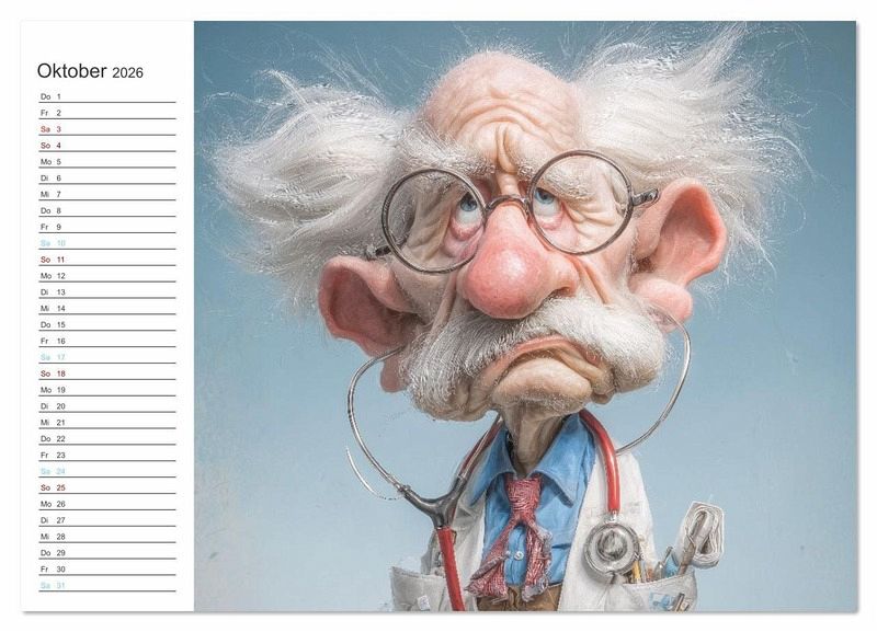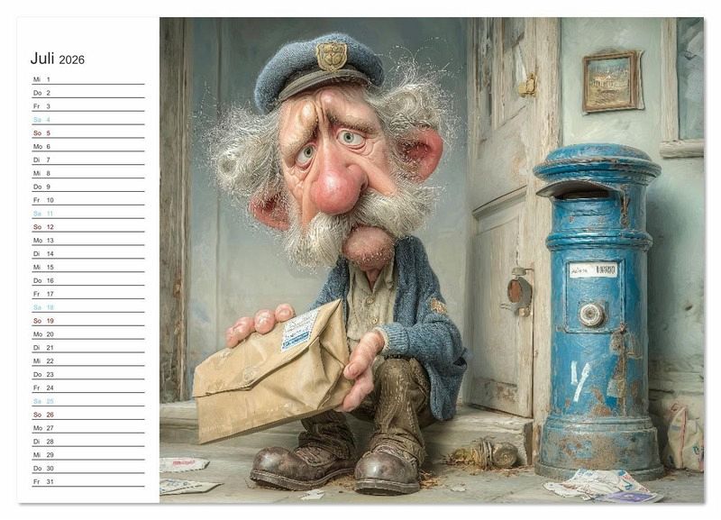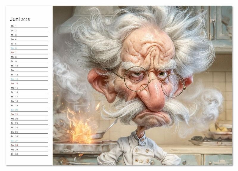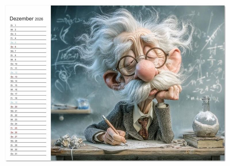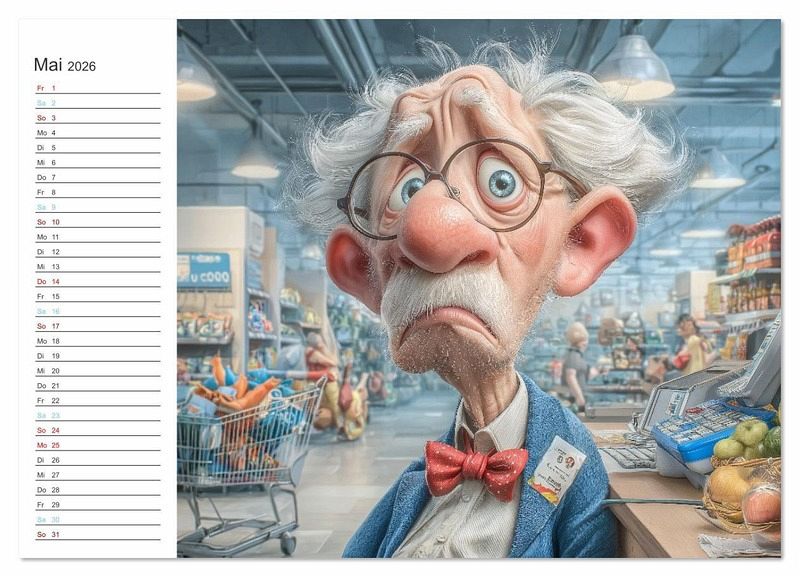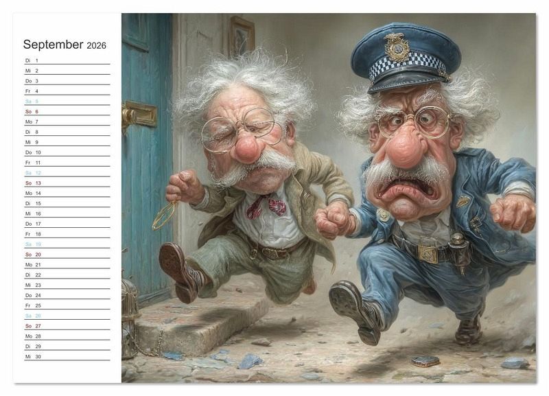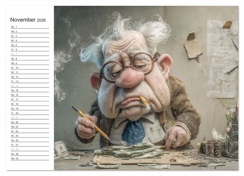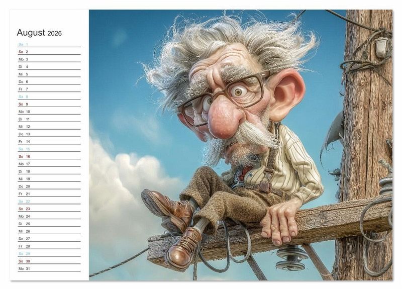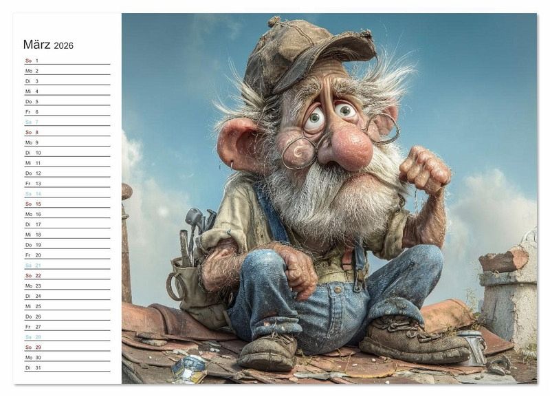 Perfekt für alle, die den Humor noch nicht an der Garderobe abgegeben haben - und die ihre Rente lieber mit einem Augenzwinkern betrachten (sofern sie die Brille finden). Alle hier gezeigten Bilder wurden mit Sorgfalt, Liebe und mit Hilfe einer KI generiert. Abschließend werden sie mit Bildbearbeitungsprogrammen überarbeitet und in den Kalender eingefügt.
