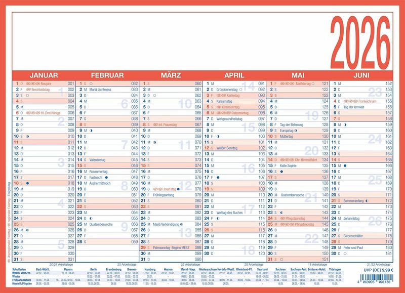 Kalendertyp: Arbeitstagekalender Typ 908 Übersichtliches Kalendarium: 6 Monate pro Seite, Vorderseite Januar Juni, Rückseite Juli Dezember Strukturierte Planung: Mit Arbeitstage-, Tages- und Wochenzählung, ergänzt durch Ferienübersicht und Mondphasen Praktische Details: Wochenenden und Feiertage in Rot hervorgehoben, zusätzlicher Notizbereich oberhalb des Kalendariums Hochwertige Verarbeitung: Auf 1,5 mm starker Pappe kaschiert für lange Haltbarkeit Format & Ausstattung: 29 × 21 cm (A4), stabile Tafelausführung für Büro, Schule und Zuhause Nachhaltig produziert: Hergestellt in Deutschland, mit deutschem Kalendarium