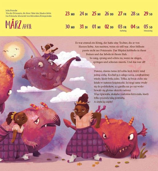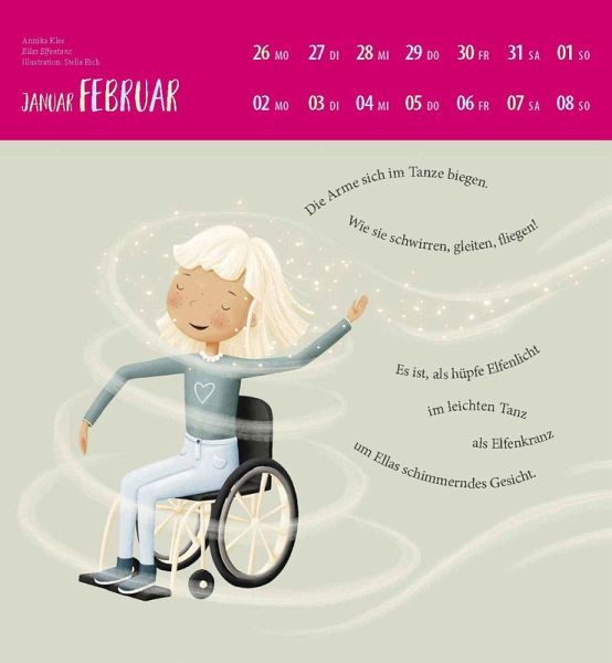 Der Arche Kalender Starke Mädchen zeigt alle zwei Wochen starke weibliche Figuren aus der Kinderliteratur und erzählt Geschichten, die Rollenbilder hinterfragen. Zum Beispiel von Marie Curie, die die Radioaktivität entdeckte und und von Köhlermariechen, die angeblich gefährliche Drachen nicht bekämpft, sondern rettet. Von Anna, die sich zusammen mit ihrer Oma gegen die Bebauung des Waldes wehrt, oder von Ella, die mit ihrem Elfentanz im Rollstuhl das Publikum verzaubert.