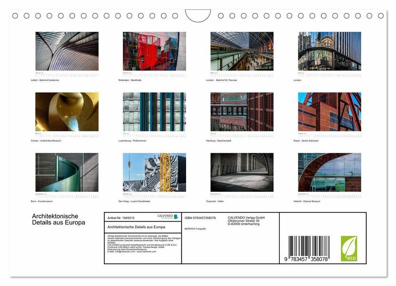 QUALITÄT - Hochwertiger Fotokalender mit 12 wunderschönen Motiven auf lichtbeständigem Bilderdruckpapier, robuste Spiralbindung mit Aufhängebügel.NACHHALTIG - deutliche Abfallreduzierung durch bedarfsgerechte Einzelstückfertigung, umweltfreundliches FSC-zertifiziertes Papier, Produktion in Deutschland,klimabewusste Logistik.PERFEKTES GESCHENK - Kalender für Freunde und Familie, für Kinder und Erwachsene, jung und alt, zu Weihnachten, Geburtstag oder zwischendurch.VIELFALT - Bildkalender in verschiedenen Formaten, z.B. DIN A5, DIN A4, DIN A3 sowie DIN A2. Ob Naturmotiv, Gemälde oder Fotos, ideal für ein persönliches Wohlfühlambiente.Fotografische Perspektiven europäischer Architektur von Autor(in): BERWICK - Fotografie