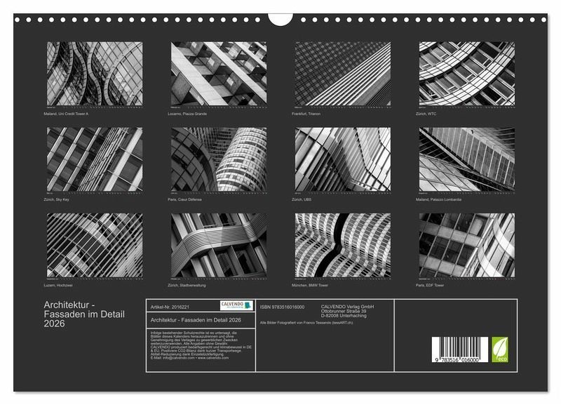QUALITÄT - Hochwertiger Fotokalender mit 12 wunderschönen Motiven auf lichtbeständigem Bilderdruckpapier, robuste Spiralbindung mit Aufhängebügel.NACHHALTIG - deutliche Abfallreduzierung durch bedarfsgerechte Einzelstückfertigung, umweltfreundliches FSC-zertifiziertes Papier, Produktion in Deutschland, klimabewusste Logistik.PERFEKTES GESCHENK - Kalender für Freunde und Familie, für Kinder und Erwachsene, jung und alt, zu Weihnachten, Geburtstag oder zwischendurch.VIELFALT - Bildkalender in verschiedenen Formaten, z.B. DIN A5, DIN A4, DIN A3 sowie DIN A2. Ob Naturmotiv, Gemälde oder Fotos, ideal für ein persönliches Wohlfühlambiente.Moderne Architektur fotografisch im Detail festgehalten. von Autor(in): Franco Tessarolo