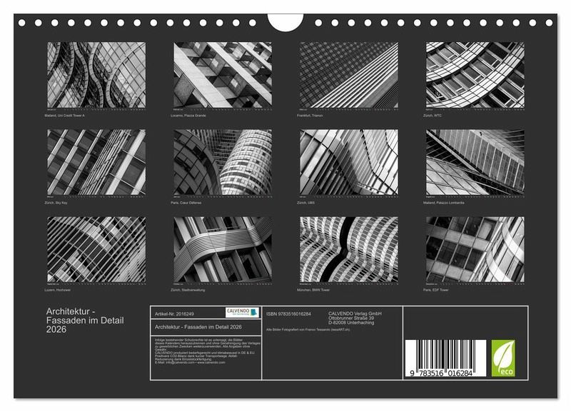 QUALITÄT - Hochwertiger Fotokalender mit 12 wunderschönen Motiven auf lichtbeständigem Bilderdruckpapier, robuste Spiralbindung mit Aufhängebügel.NACHHALTIG - deutliche Abfallreduzierung durch bedarfsgerechte Einzelstückfertigung, umweltfreundliches FSC-zertifiziertes Papier, Produktion in Deutschland, klimabewusste Logistik.PERFEKTES GESCHENK - Kalender für Freunde und Familie, für Kinder und Erwachsene, jung und alt, zu Weihnachten, Geburtstag oder zwischendurch.VIELFALT - Bildkalender in verschiedenen Formaten, z.B. DIN A5, DIN A4, DIN A3 sowie DIN A2. Ob Naturmotiv, Gemälde oder Fotos, ideal für ein persönliches Wohlfühlambiente.Moderne Architektur fotografisch im Detail festgehalten. von Autor(in): Franco Tessarolo