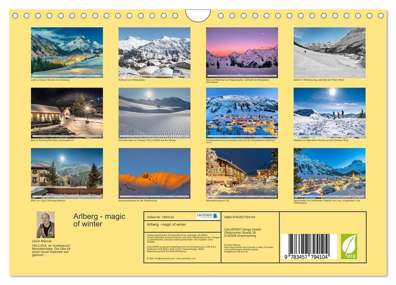 Lech als "Best of the Alps" bezeichnet, lockt seit über einem Jahrhundert Wintersportler und Urlauber aus aller Welt für fünf Monate zum Arlberg. Vom hochalpinen Tiefschneefahren bis zum Wandern in traumhafter Winterlandschaft, ist Genuss am Berg und im Schnee für alle garantiert. Der traumhafte Blick auf die Monzabonalpe und Valluga waren Anstoß für diesen neuen Kalender.