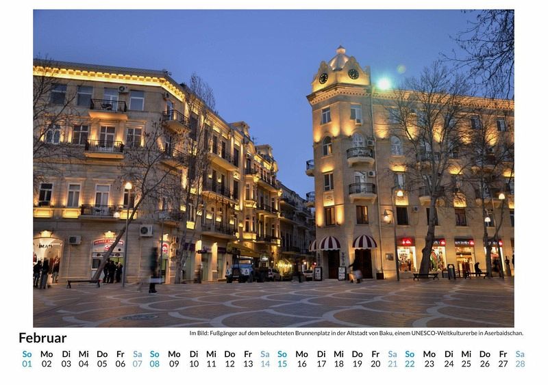 Entdecken Sie die faszinierende Schönheit Aserbaidschans mit unserem exklusiven Wandkalender! Lassen Sie sich Monat für Monat von 12 atemberaubenden Motiven verzaubern - von den majestätischen Kaukasus-Bergen bis hin zu den historischen Schätzen der Hauptstadt Baku. Gedruckt auf hochwertigem, lichtbeständigem Bilderdruckpapier, bringt dieser Kalender die Vielfalt und Kultur Aserbaidschans direkt in Ihr Zuhause. Nachhaltigkeit liegt uns am Herzen: Unsere Kalender werden in Deutschland auf FSC-zertifiziertem Papier produziert. Perfekt als Geschenk oder für die eigene Wand - holen Sie sich ein Stück Aserbaidschan in Ihr Leben! Jetzt bestellen und jeden Monat neu staunen! Hochwertig Erleben Sie ein Jahr voller Eleganz mit unserem Premium-Fotokalender. Jedes der 12 Motive ist auf hochwertigem, lichtbeständigem Bilderdruckpapier gedruckt, um die Lebendigkeit jedes Bildes zu bewahren. Die robuste Spiralbindung gewährleistet Langlebigkeit und einfache Handhabung. Nachhaltig Unser Engagement für die Umwelt spiegelt sich in jedem Exemplar wider. Durch die Produktion auf Abruf reduzieren wir signifikant unseren Abfall. Wir verwenden ausschließlich umweltfreundliches, FSC-zertifiziertes Papier. Stolz gefertigt in Deutschland, achten wir bei unserer Logistik auf Klimaschutz, um unseren ökologischen Fußabdruck zu minimieren. Das ideale Geschenk Dieser Kalender ist das perfekte Präsent für jeden Anlass - ob Weihnachten, Geburtstage oder einfach als liebevolle Aufmerksamkeit zwischendurch. Geeignet für Freunde, Familie, Kinder und Erwachsene gleichermaßen, bereichert er jedes Zuhause mit seiner Vielfalt und Schönheit, unabhängig vom Alter der Beschenkten.