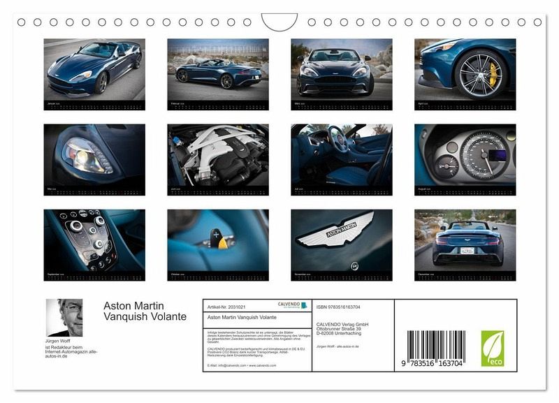 QUALITÄT - Hochwertiger Fotokalender mit 12 wunderschönen Motiven auf lichtbeständigem Bilderdruckpapier, robuste Spiralbindung mit Aufhängebügel.NACHHALTIG - deutliche Abfallreduzierung durch bedarfsgerechte Einzelstückfertigung, umweltfreundliches FSC-zertifiziertes Papier, Produktion in Deutschland, klimabewusste Logistik.PERFEKTES GESCHENK - Kalender für Freunde und Familie, für Kinder und Erwachsene, jung und alt, zu Weihnachten, Geburtstag oder zwischendurch.VIELFALT - Bildkalender in verschiedenen Formaten, z.B. DIN A5, DIN A4, DIN A3 sowie DIN A2. Ob Naturmotiv, Gemälde oder Fotos, ideal für ein persönliches Wohlfühlambiente.Der Aston Martin Vanquish Volante von Autor(in): Jürgen Wolff